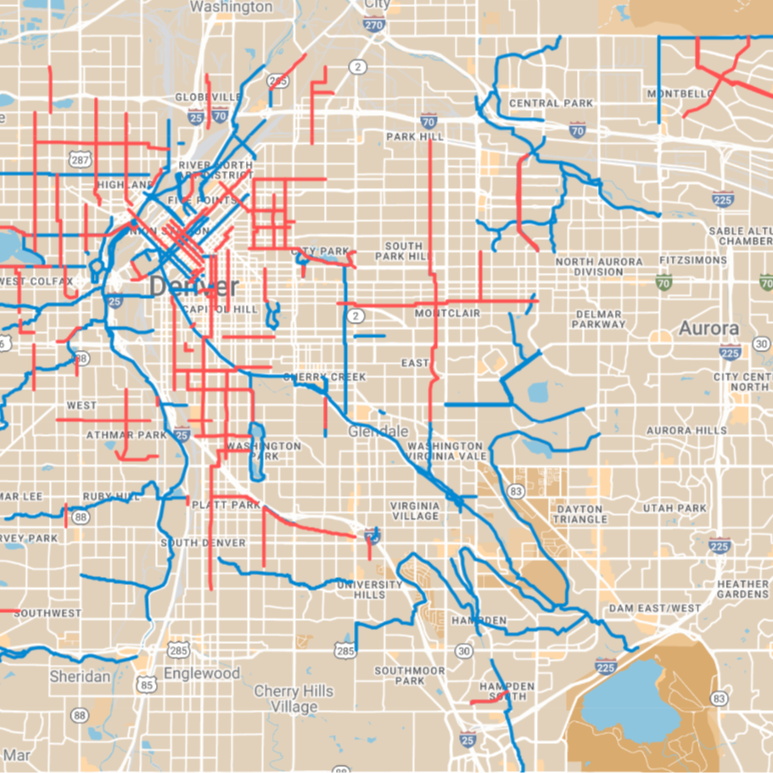 We always consider these maps to be works in progress. We first launched the Denver map in 2018. In 2025, we added the surrounding metro area and released dozens of new versions of the map. Low-Stress Bike Maps evolve as cities build new infrastructure and as our understanding grows of how to navigate a community by bike.
