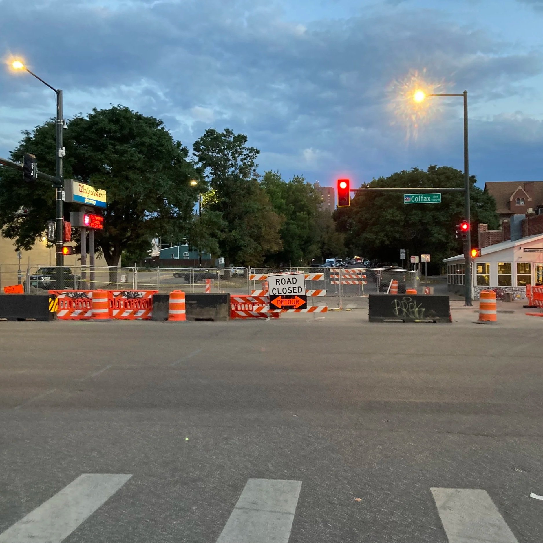 Construction creates a temporary traffic diverter — a de facto demonstration project — at Race and Colfax in Denver, CO.