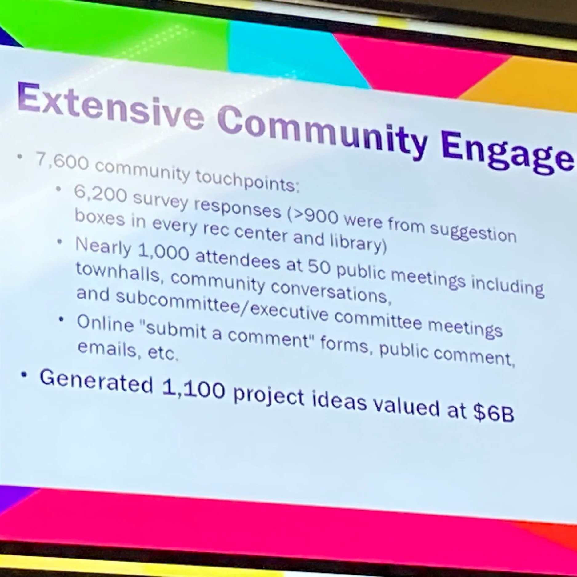 A slide from the 2025 Vibrant Denver Bond pitch deck trumpets 7,600 community touchpoints — that’s barely 1% of the city’s population — and 50 public meetings across the city with an average of 20 people per meeting.