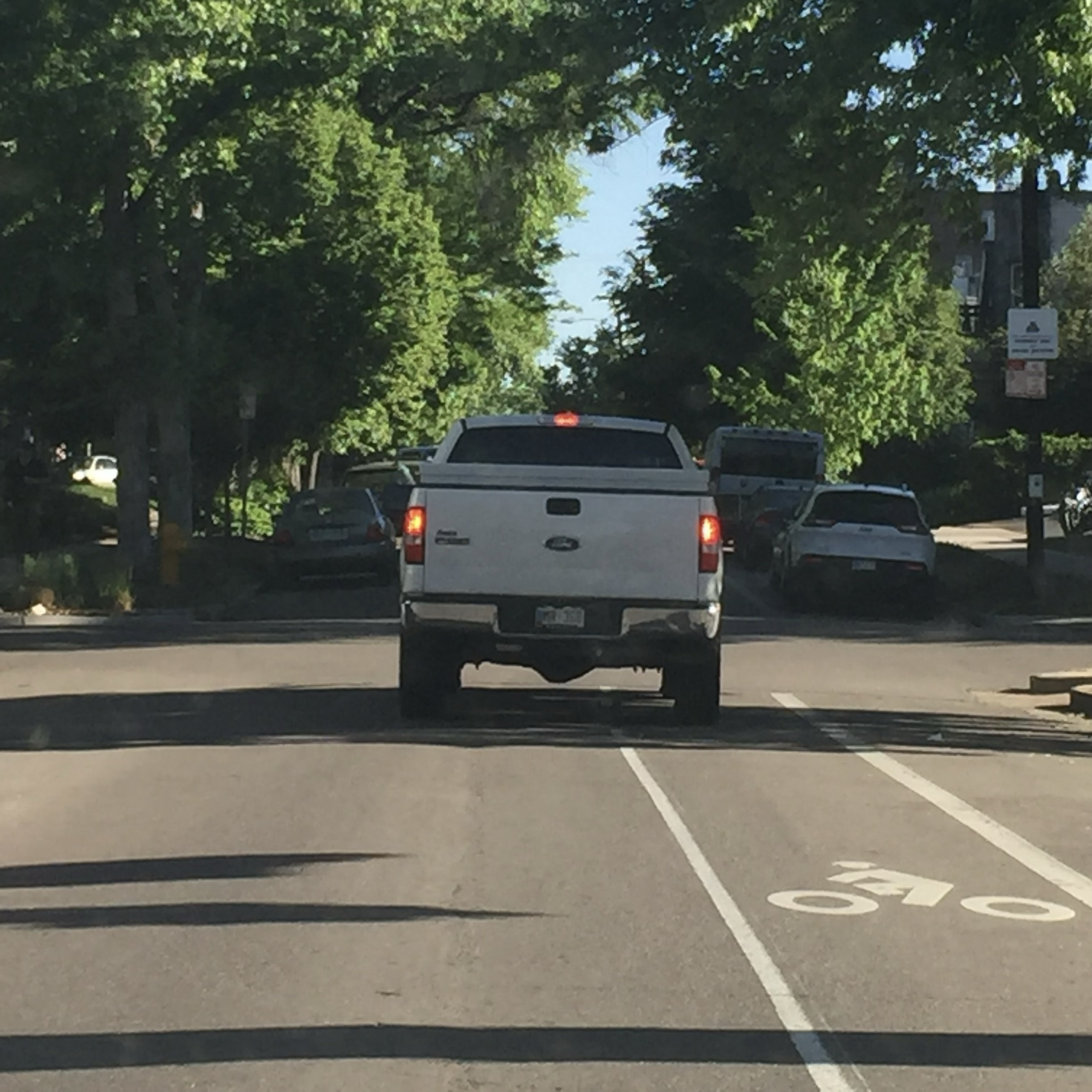 A kinda protected bike lane in Denver, as a driver monster trucks Ziclas.